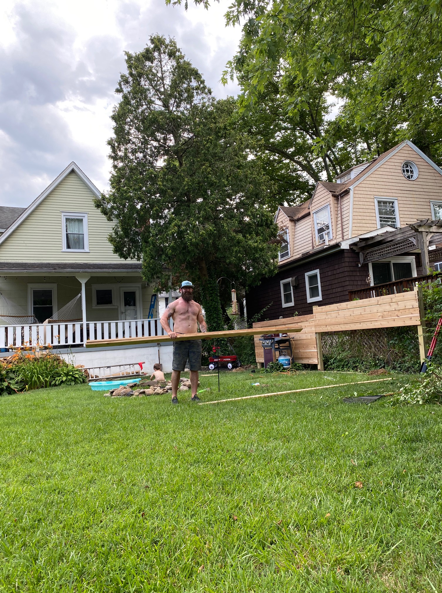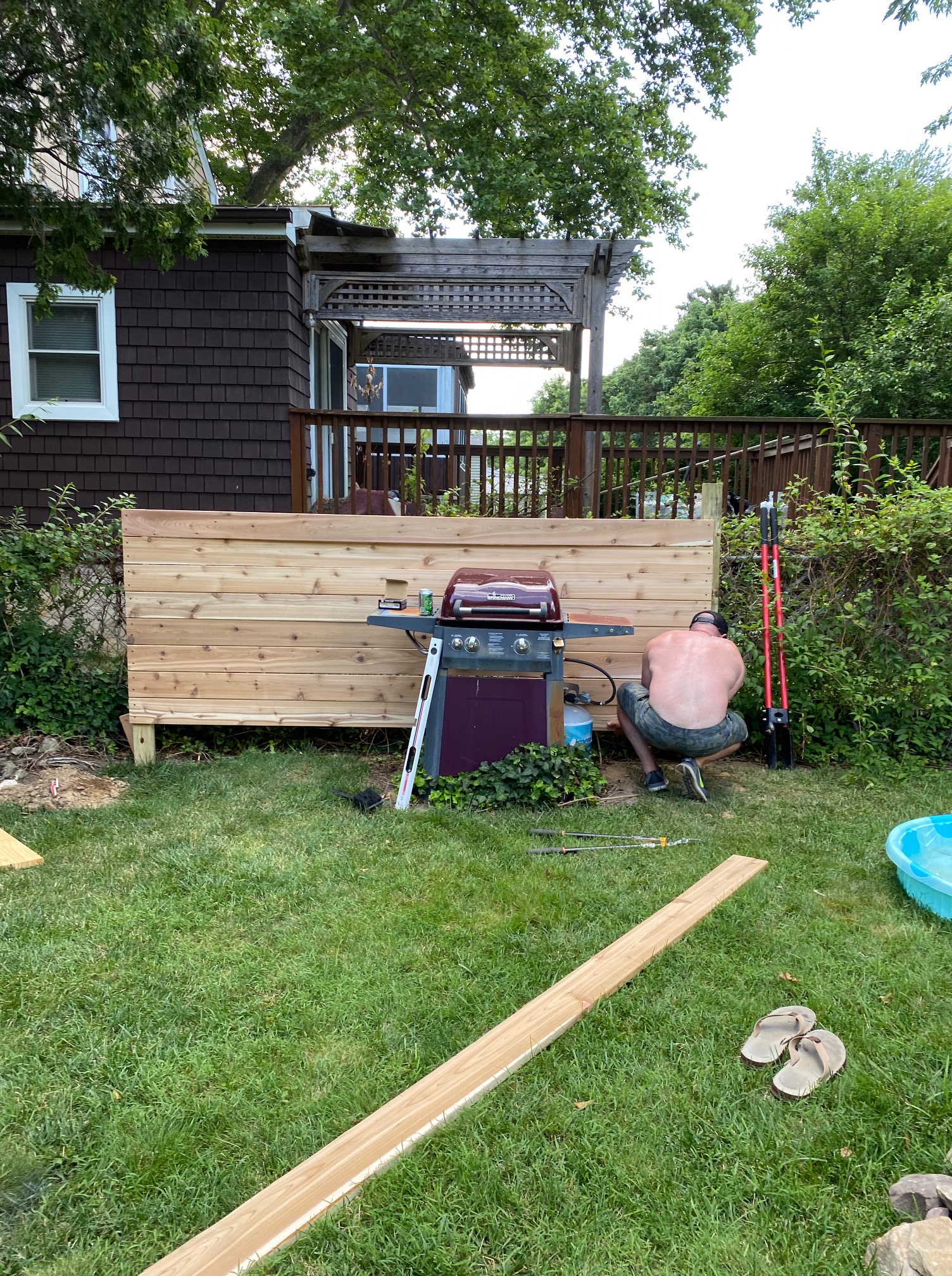 Here’s where we were dumb — we did this in the dead heat of July. However, both Brent and I, with some help from Brent’s brother, whipped the fire pit area into shape. First, Brent made a privacy wall with cedar planks along the fence line abutting our neighbor’s property.