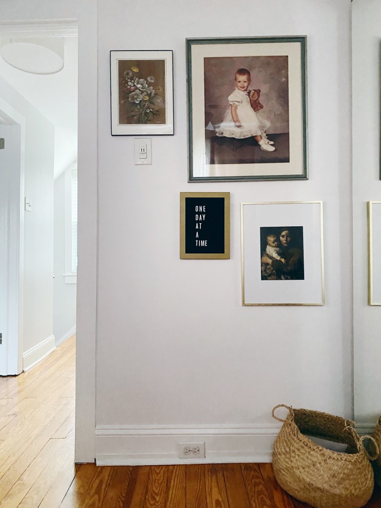 I looked up some tips and tricks and decided not paint the frame black before using the Rub ‘n Buff. I used the color Antique Gold and applied it with a makeup brush. And I love it. It really works well with the other photos and adds a little life back to this 80s photo.