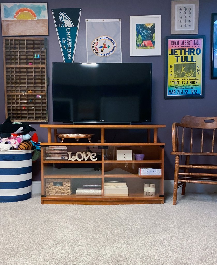 Make a space that will grow with the kids as their needs and interests change. Invest in a few key pieces that will work for kids when they are little, and also when they are bigger kids and teens. I suggest picking good seating, like comfy bean bag chairs and functional storage pieces to store toys, board games, and video game devices. Lastly, get the kids involved in creating the space as they will be spending the most time in the basement. – Coffee, Pancakes & Dreams