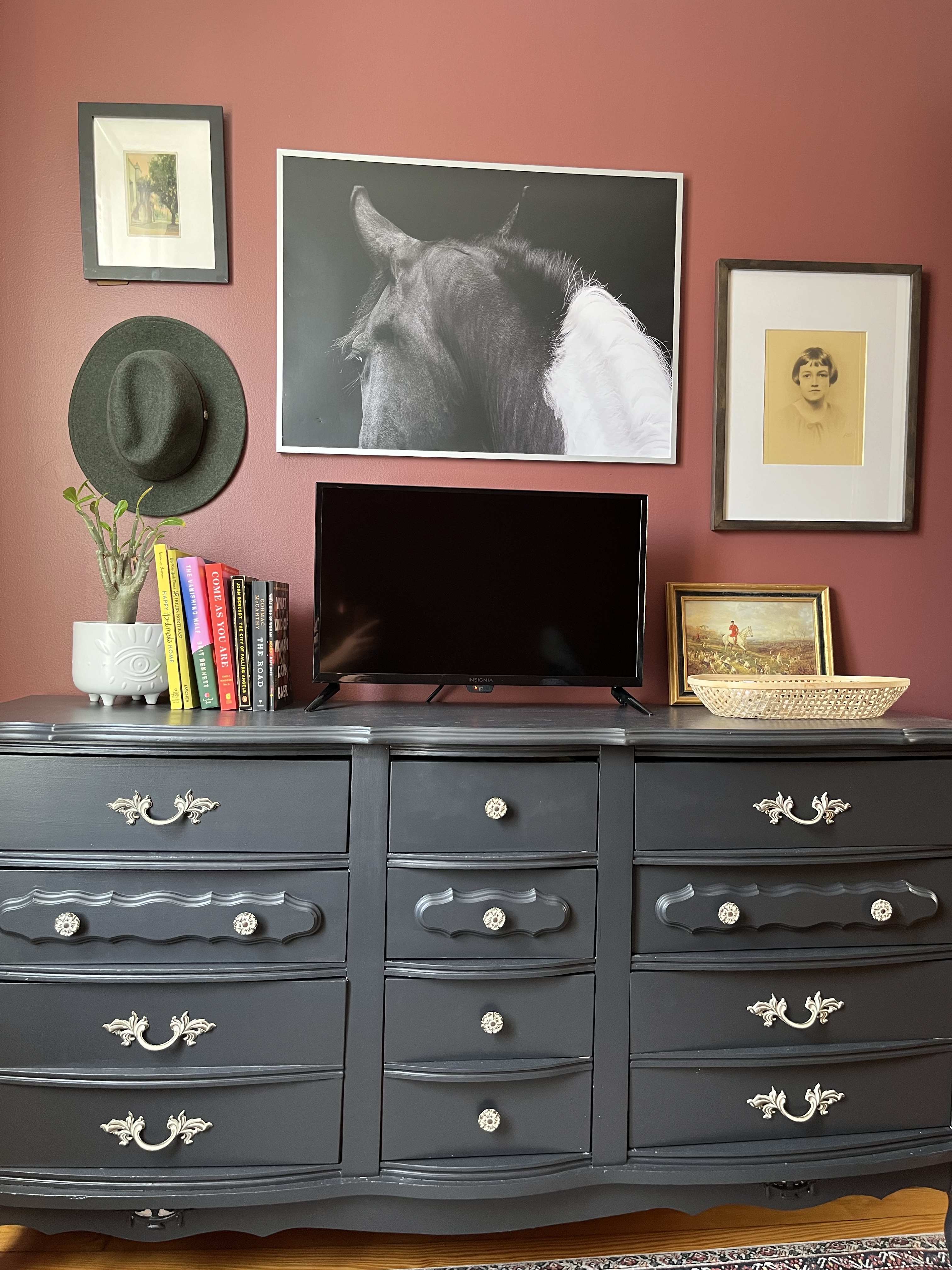 Originally, I thought that this would just continue to be the plan and wherever my mom would stay, the room would continue to be a catch all room. It’s state at the time was my office and hang out space – which I had just painted with a warm terracotta color (Benjamin Moore’s “Fading Twilight”).